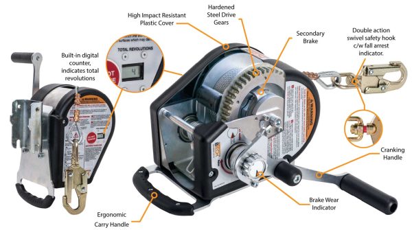 These winches offer the user the ability to safely access and egress a wide variety of confined spaces. The winch is equipped with a brake wear indicator so that the operator can check the brake condition at a glance. A secondary safety brake is also fitted to ensure the users safety in the event of the primary brake failing.