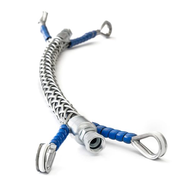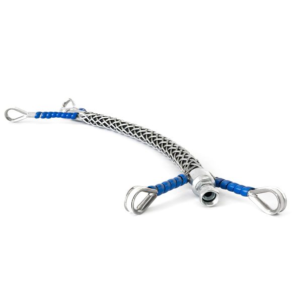 Four eye hose restraints protect high pressure hoses from shackle point to shackle point. The restraint prevents whipping should the hose fail at any point along the assembly.