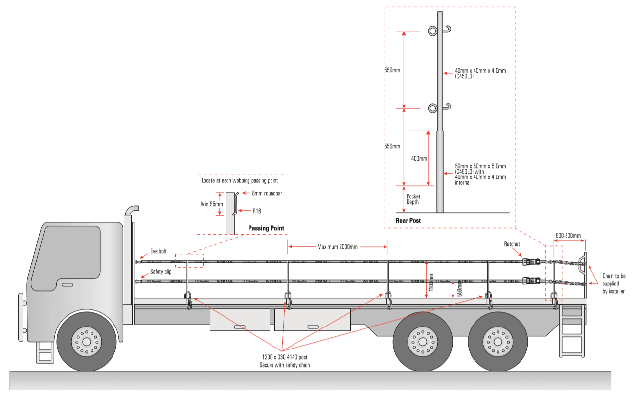 • Eye bolt/fitting and force requirements as per rear post details above